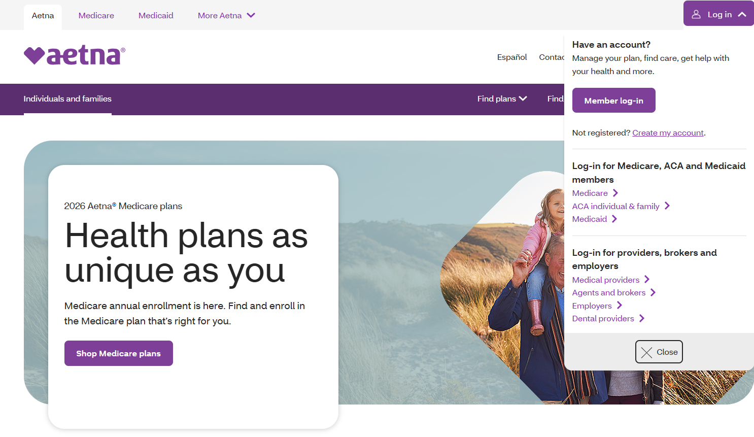 Step 1: Go to aetna.com and click the 'Log in' button, then the 'Member log-in' button.