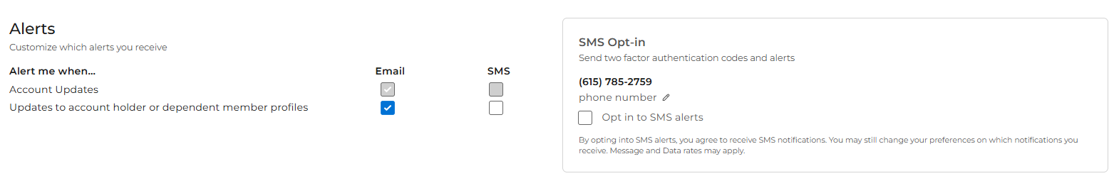 Check the SMS box to turn text notifications on, or uncheck it to turn them off. You can also select the check box in the SMS Opt-in section called Opt in to SMS alerts.